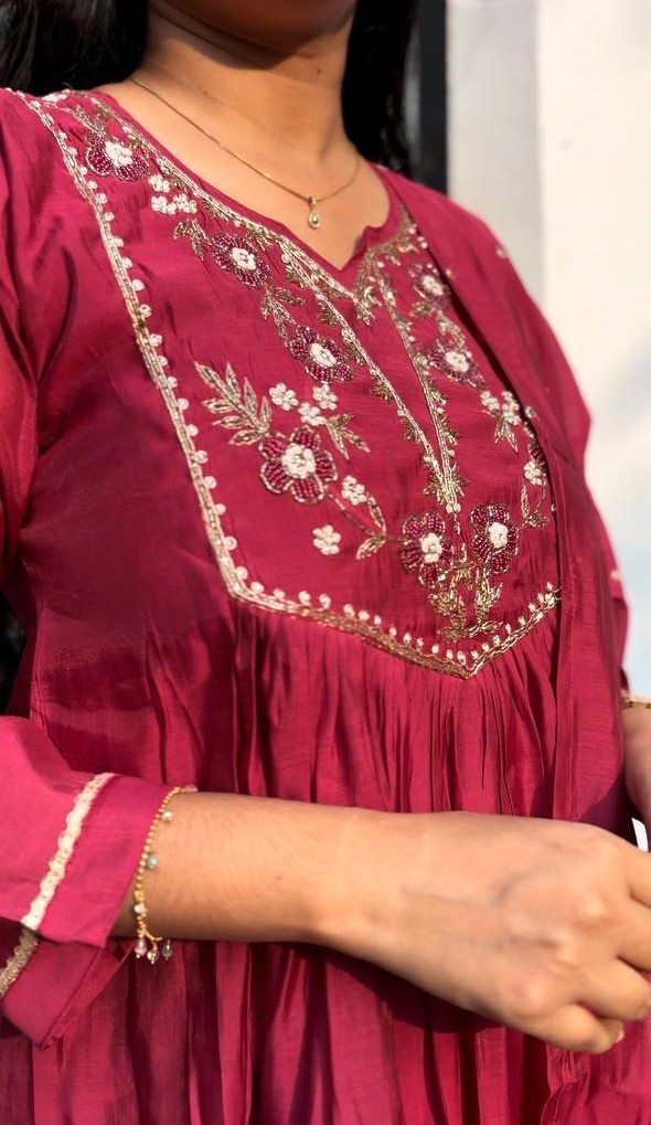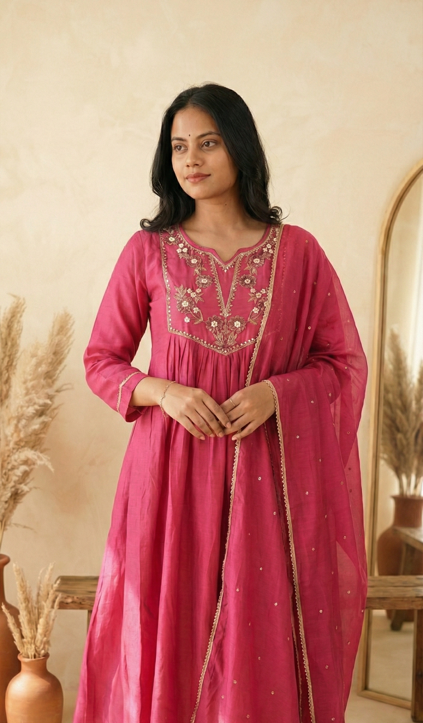 Classic Anarkali silhouette with soft gathers starting from the bust.