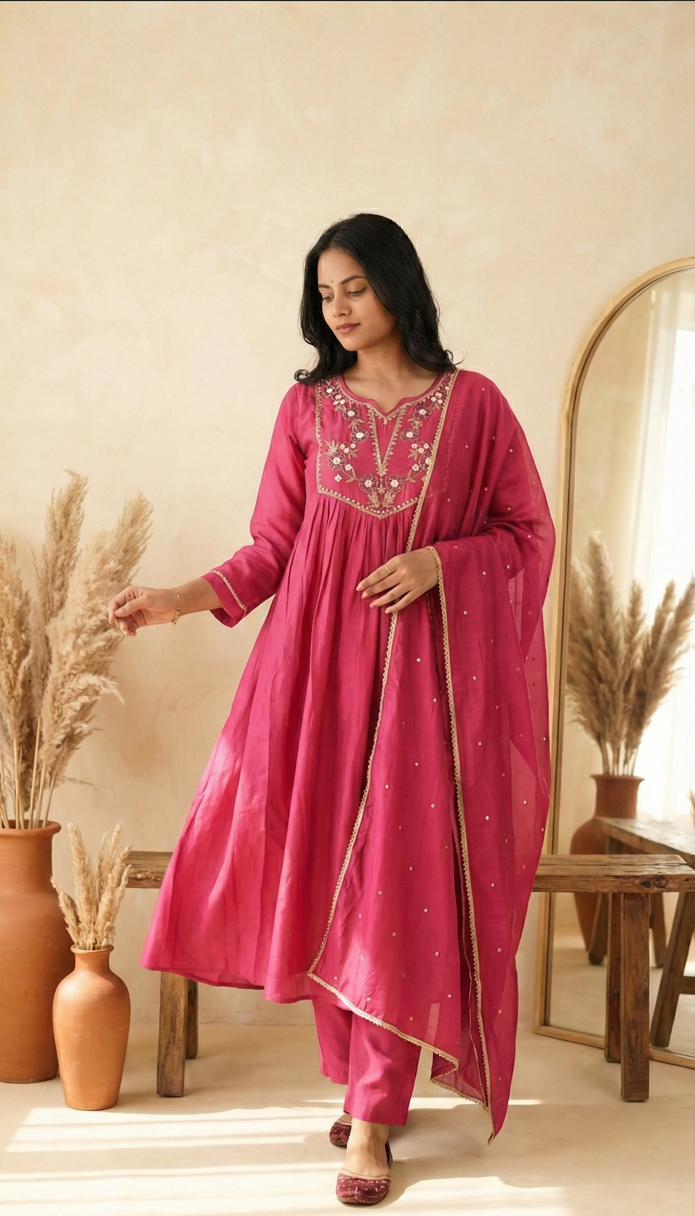 Fabric: Pure Silk Chanderi (has a rich sheen).